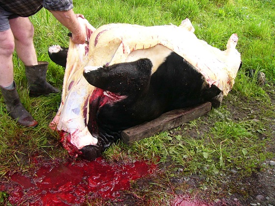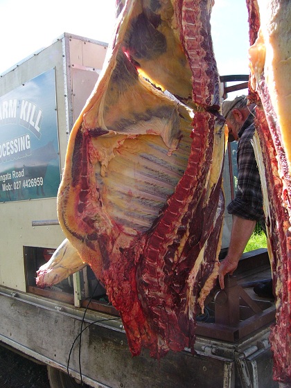 When it comes to beef there is just too much there for me at the moment. If I stuff up a lamb I am out less than a hundred bucks. With a steer it is more like being out thousands. So, I use a local homekill professional to kill and process my beef. He comes along and dispatches the animal on site and does the preliminary butchery here. The process is basically the same as for the sheep except on a larger scale.