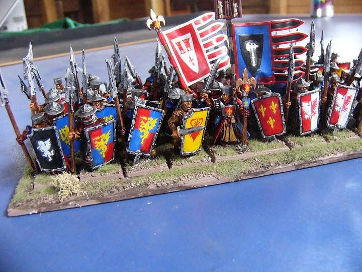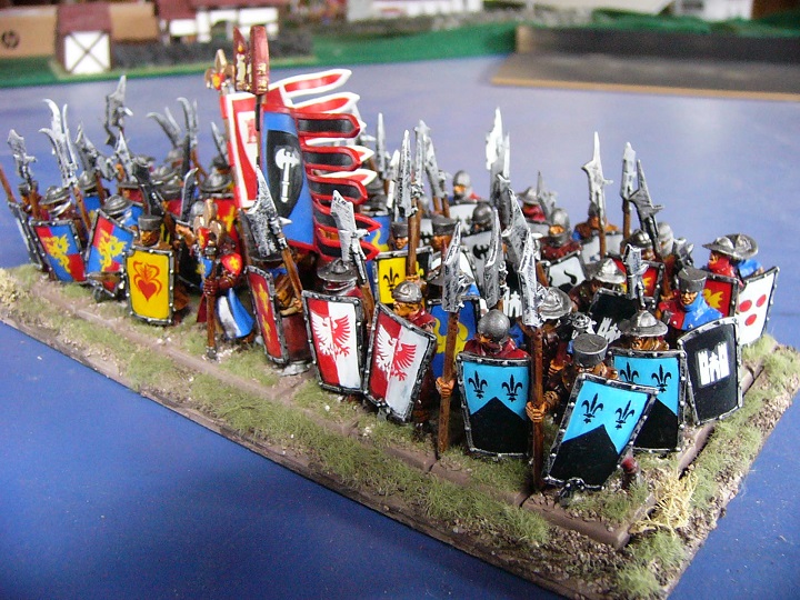 I had a whole bunch of Front Rank 100YW or War of the Roses figures so chucked them in as well. Hacked arms off, added shield, the odd head swap and gave them some humongous Games Workshop halberds.