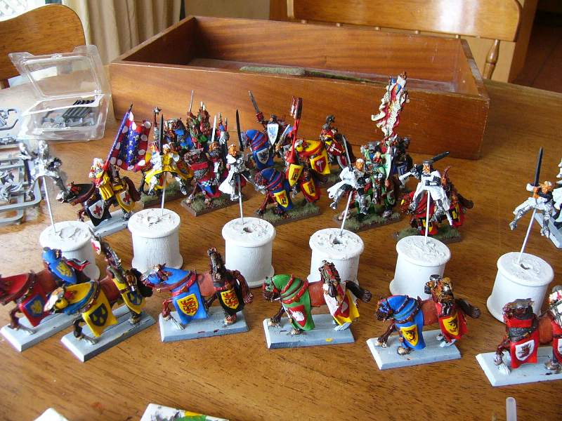 I have been mucking around painting these guys on and off for the last ten years – since the 6th Edition Bretonnian release back in 2004. Kind of fun to do, but I am not sure what I will ever do with them.  These are some Bretonnian Questing Knights I am working on in between painting Napoleonics.  They are pretty much completed now and when I get back home I will post new pictures.