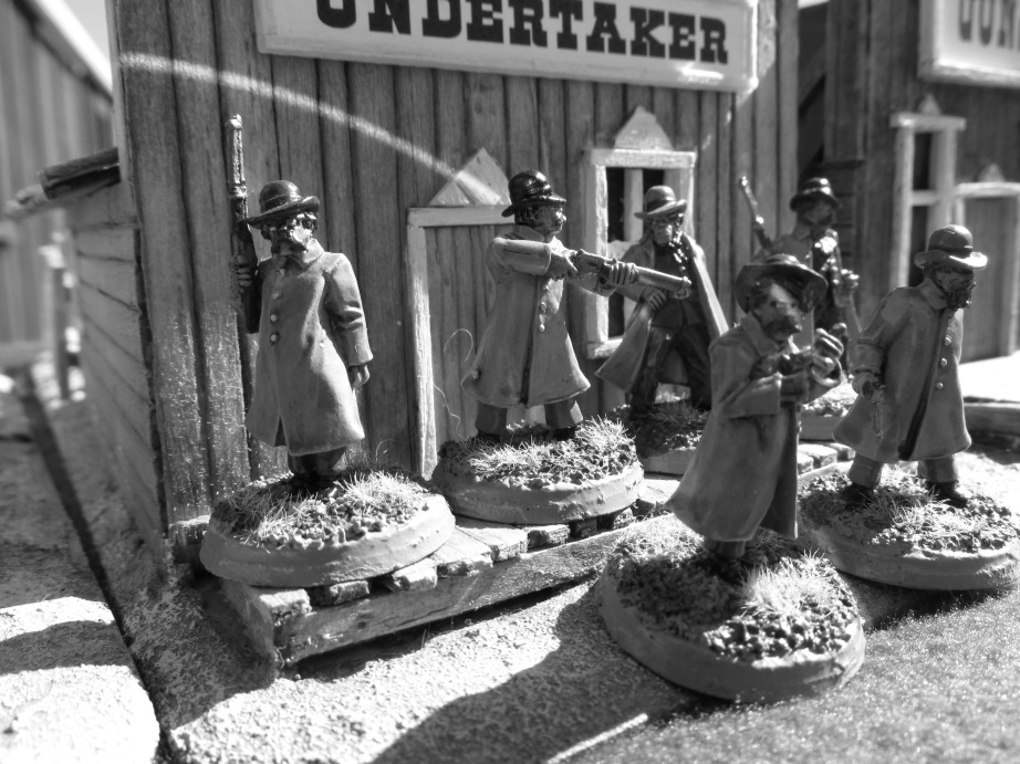 A popular faction in Wild West skirmish games is a gang of Pinkerton Detectives. Artizan Designs make two sets with six really nice figures. Set one has two rifleman and a pistolier and Set Two has two men armed with pistols and another man with a Winchester. All are wearing classic Duster coats over their suits and waistcoats. These are my attempt at doing these fine figures some justice. The buildings are amongst the first ones I made and I got the door height a bit wrong in relation to figure and base size.