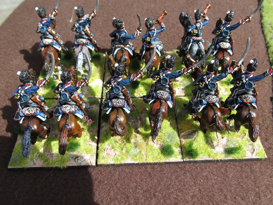 I have two regiments of Elite Miniatures early-mid Peninsular War British cavalry to get painted. A heavy and a light dragoon regiment. These Lights are the the first to be painted. Got them done over the lat three days, which has to be a record for me. Painted as the 16th Light Dragoons (scarlet facings and white lace). Not that I let that bother me too much. These Elite figures are really nice. Highly animated and looking just right for a British cavalry regiment that will “Gallop at Anything”.