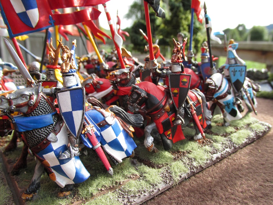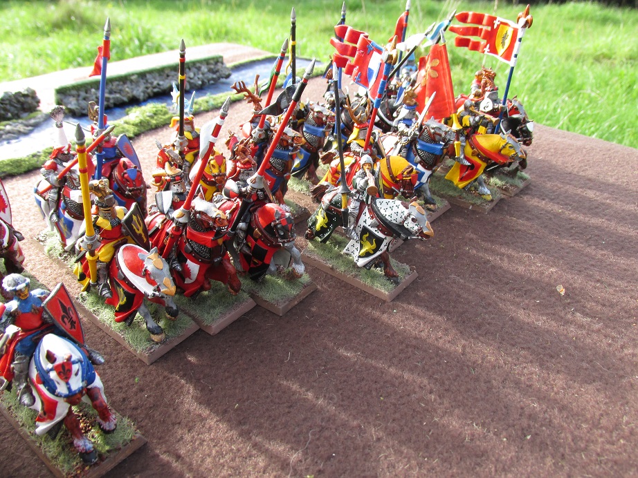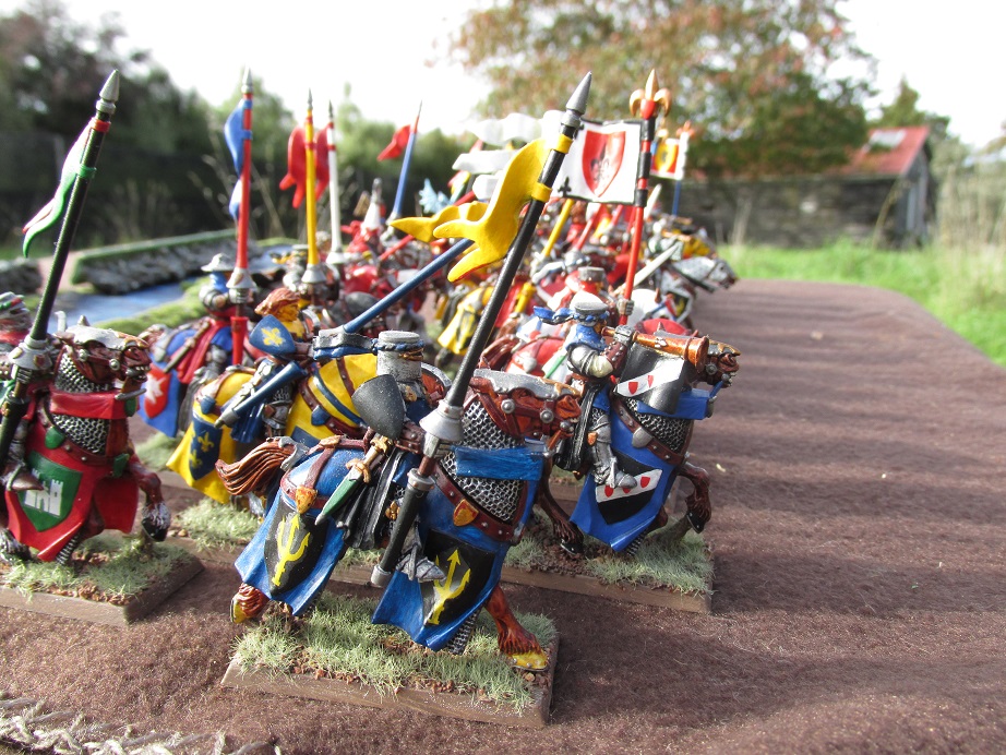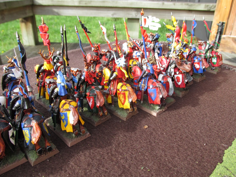 Every now and then I get the urge to paint a few more knights or peasants for my Warhammer Fantasy Bretonnian army, even though I have very few games behind me using that system. I try to stick to plain primary colours on my knights. So there are lots of Blues, reds and yellows. Every knight has his own heraldry – one of the things I enjoy most about doing this army is the heraldry.