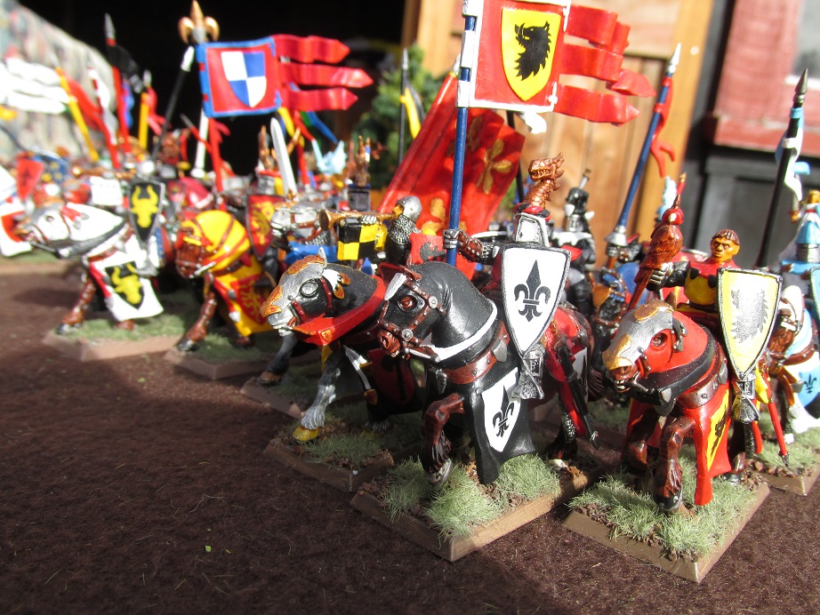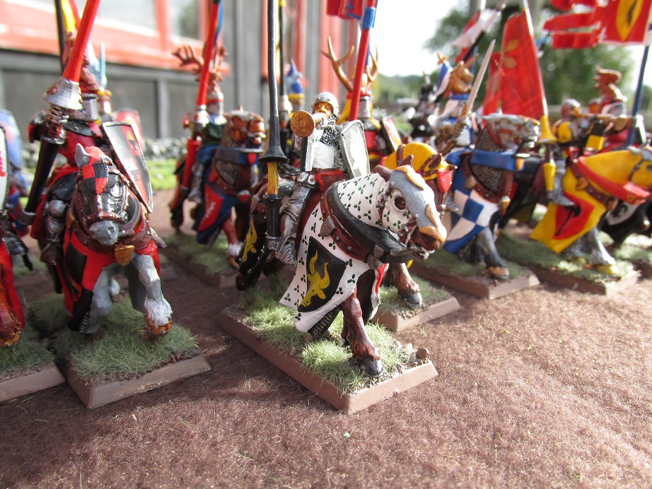 The knight in the second rank has a heraldry done with decals from a Space marines decal set. Waste not want not. Behind him I used a 5th Edition helmet on a 6th Ed body. There are quite a few of these to be seen in my army.