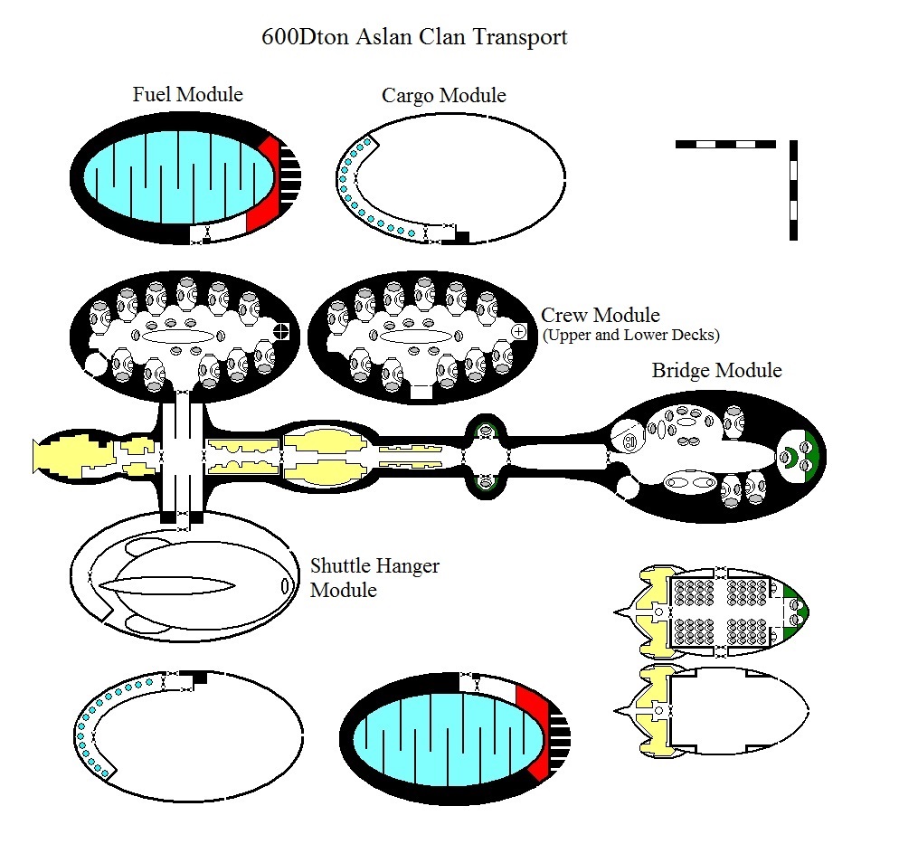 Here is the deckplan. Hope it comes in useful.  Note: the crew module has two levels.  Only one level shown on the plan for the FTL drive.Aslan clan transport mk1I also did a version in case you use FTL drive in your game rather than the Traveller Jump Drive.