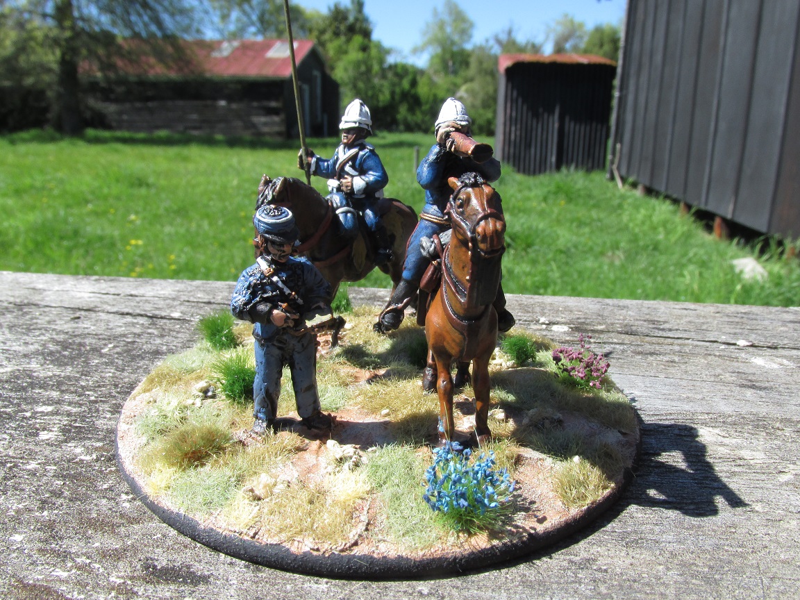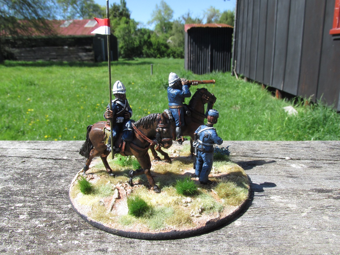 I have just finished some command stands for my Anglo-Zulu War armies. Figures are a mix of Redoubt and Black Tree Designs. All the other models I have painted and based for this project have been mounted on individual bases that slot into sabot bases. I decided to permanently fix these chaps to their respective bases.