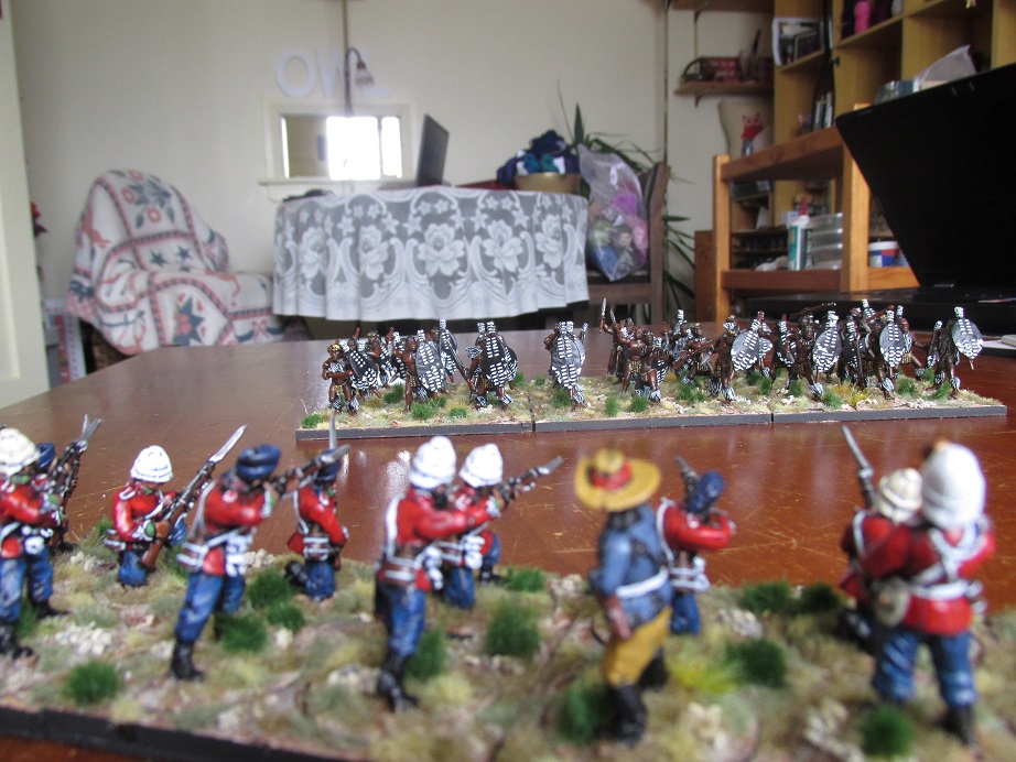 Figures are all Black Tree except for two Redoubt Miniatures – the bugler and Col. Durnford who is standing in for Capt Wardell until such time as I get home and put the correct officer in his place.