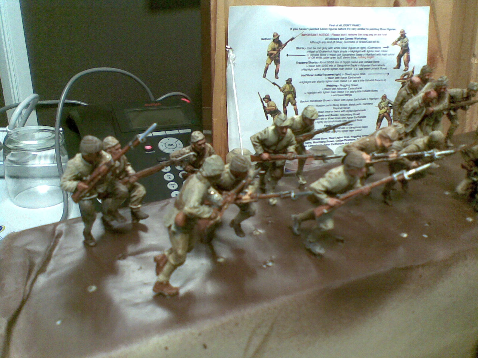 After work yesterday I went down to the Museum to help out with the diorama. My first task was to assist Russel Briant dirtying up some Turkish boots. Then I got to actually place figures on the diorama. I positioned a Turkish platoon of sixty men advancing up a hill in support of the platoon in front of them. It was a little daunting to be honest, but a lot of fun if not hard on the knees and ankles. Do the right poses work with the terrain? Make sure that the figure’s mounting pin is properly seated into the hole you have made. Don’t step on any other models already in place. Pick up any bits of polystyrene you see sitting on the diorama base.