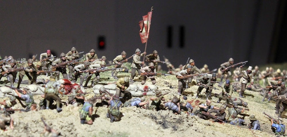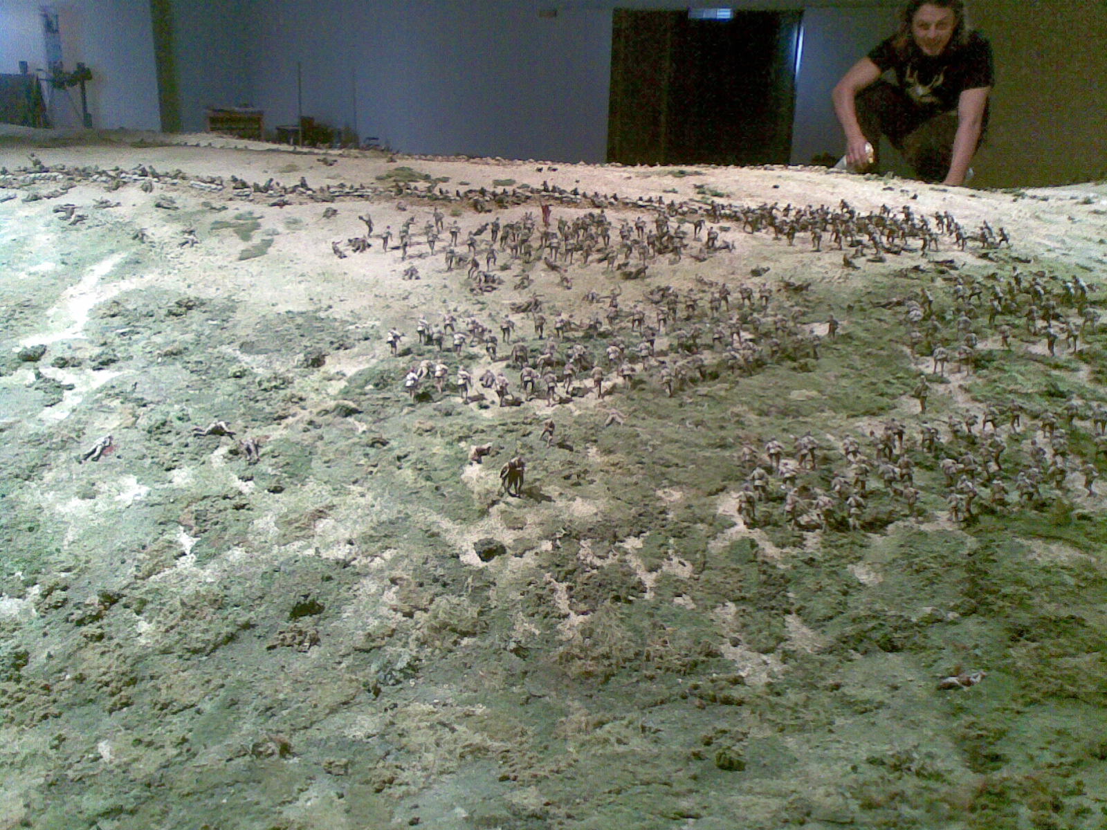 One of the Turkish platoons that I inserted into the diorama. It was, as Roly said on the official blog, tough work. Bent over, trying not to step on anything you shouldn’t – not easy on middle-aged backs. Then you had to poke a hole with an awl through the terrain – and bear in mind this could support the weight of overweight wargamers – and then position the figure.