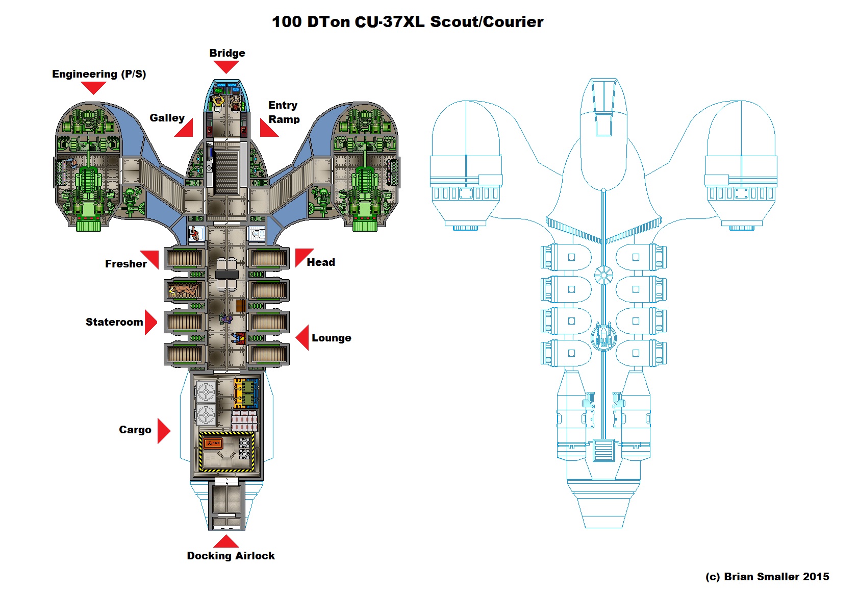 I was browsing Star Wars deckplans the other day on the internet and came across this ship – the CU-37 Light Courier and it’s extended version, the CU-37XL. It looked as if it could be Traveller-ised. So here is a 100 Displacement Ton (Dton) Scout/Courier/Small Packet merchant. This is a no-frills craft.