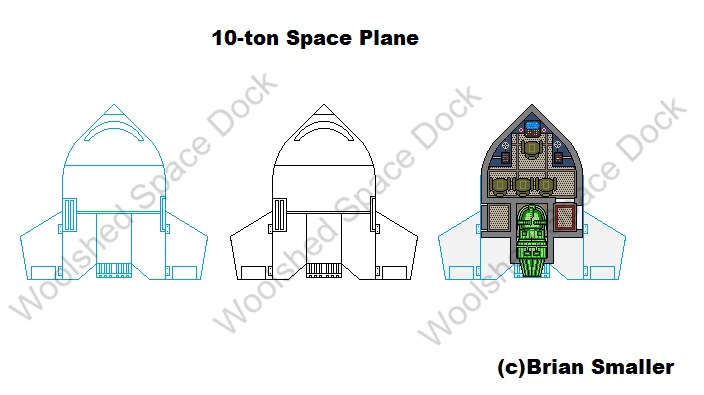 Need to get to that rendezvous in orbit with that Merchant Ship? Got to make a meeting on Ganymede Station and the Red Eye was overbooked? You need a personal 10-Dton Shuttle. Wings give that extra bit of stability in atmosphere and fold up for ease of storage in even the smallest space dock. A crew of one is required and it can carry up to three passengers and some luggage. The basic model illustrated has no bathroom so please make sure you go before lift-off.