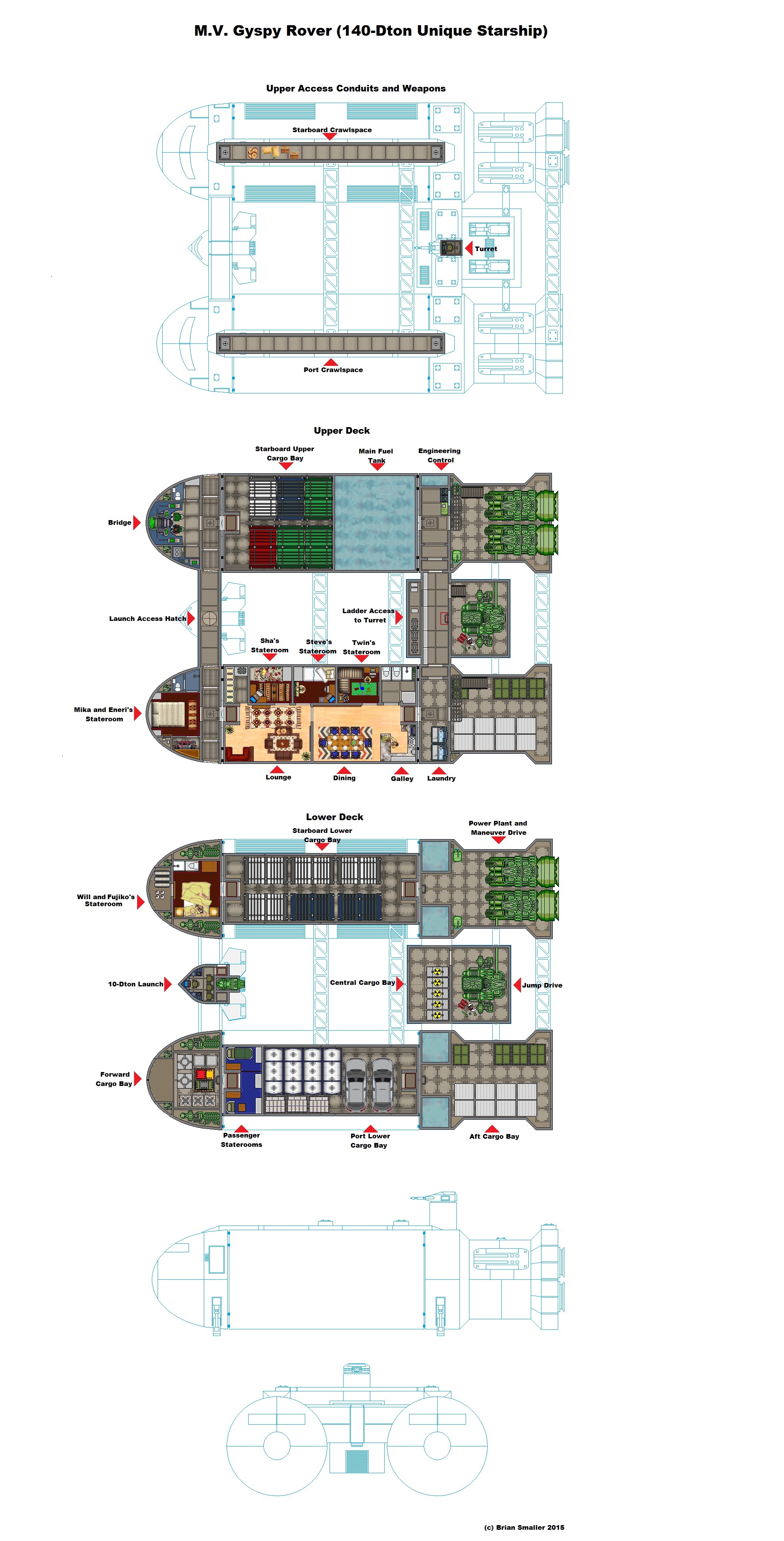 The Gypsy Rover is a unique starship. It is a jump capable ship cobbled together from parts of other vessels. The main hulls are two 50-Dton modular cutters. The cutter modules on this ship are not readily detachable and changing them would take some serious effort. The ship is streamlined but unwieldy, requiring careful piloting during critical times such as entering or leaving atmospheres and during wilderness refueling. The ship cannot enter atmosphere with the small 10-Dton shuttle attached. This is either left in orbit or flown down separately if required. Originally built by Eneri and Will’s father Gil Macklin, it has been well maintained and despite its odd appearance is a solid and reliable ship. The Gypsy Rover is usually found on the Jump 1 main but occasionally it can be found further afield; demountable internal tanks in the cargo space can be used to give her longer legs.