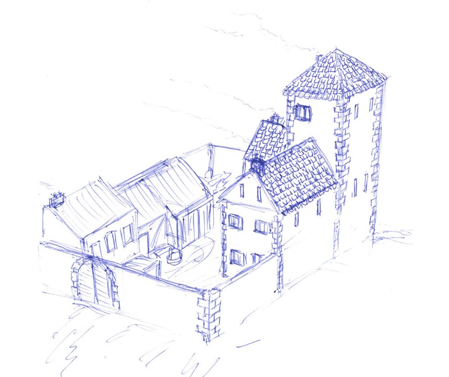 The main building has a tower that rises four stories. There is a guard barracks (by the gate), stables and a small house garden. To the right of the gate is a small entry box for the gatekeeper.