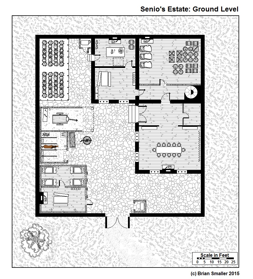 A map of a walled estate for your Fantasy Roleplaying games. In my FRPG this was the home of Senio, a necromancer. I started drawing this years ago and lost it. I found an old flash drive and found a whole pile of role-playing resources for a short lived game I ran in 2011. So I have decided to tidy the map up and post it – who knows – someone may get some use out of it. This building could be used in a town or as a country estate.