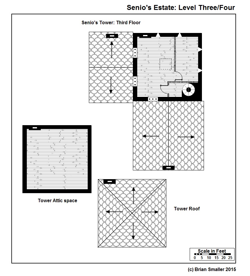 The Tower contains Senio’s main workspace and laboratory. The two other spaces are attics accessed by trapdoors from the rooms below them.
