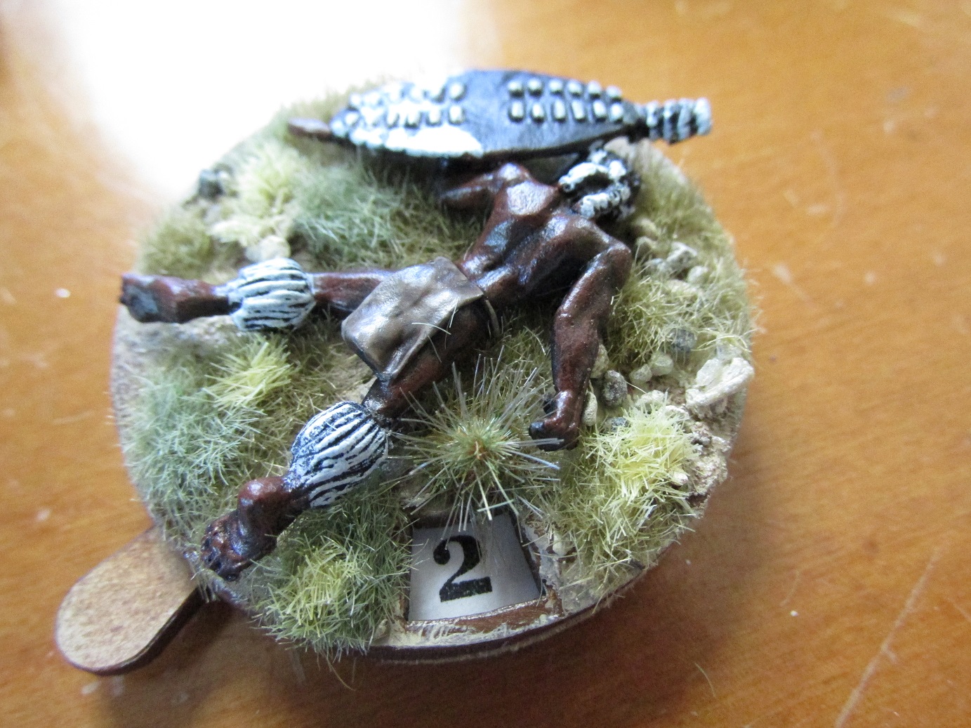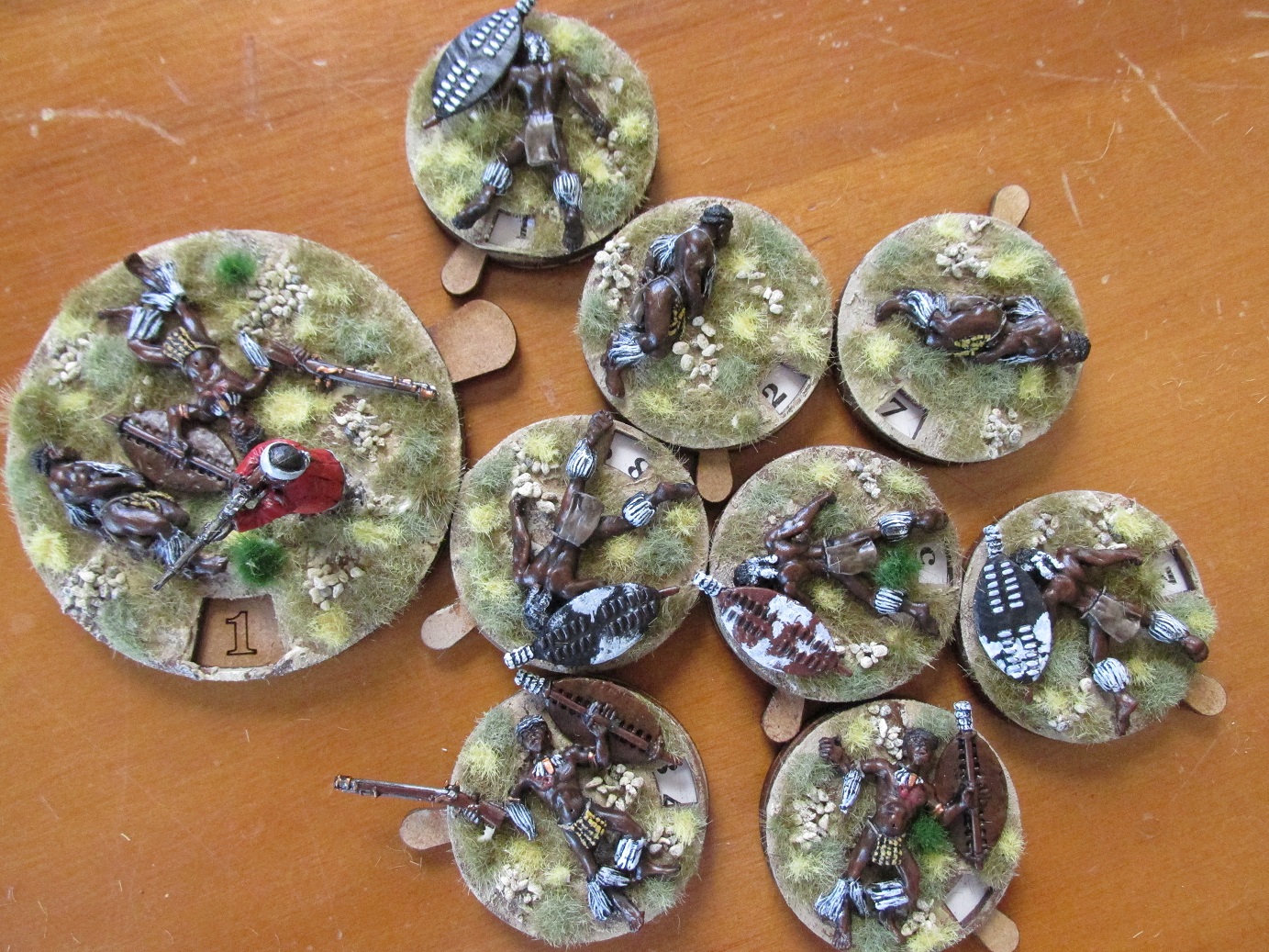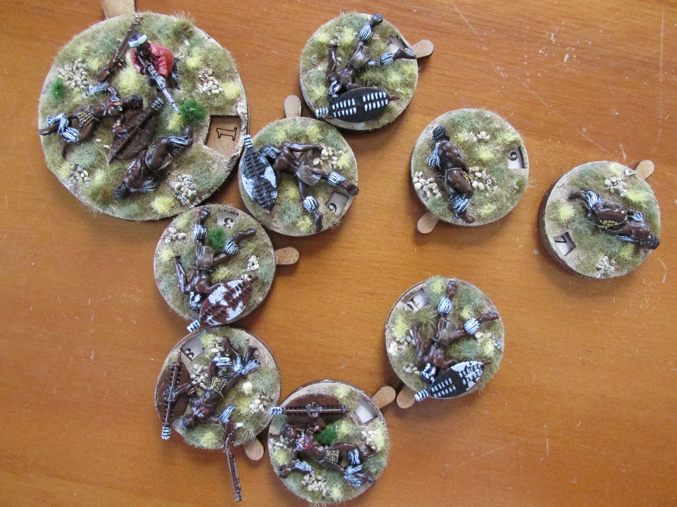 After my last Anglo-Zulu Wars game I decided that dice as casualty markers just don’t cut it. I have a good stash of the wonderful casualty/turn markers from Warbases in the UK. I also had some Zulu casualty figures from Black Tree Designs. Seemed obvious really. The bases have the numbers 0-12 so can be used for both recording casualties or as turn markers.
