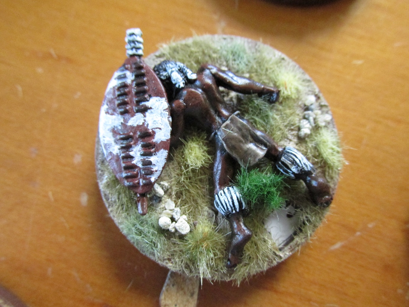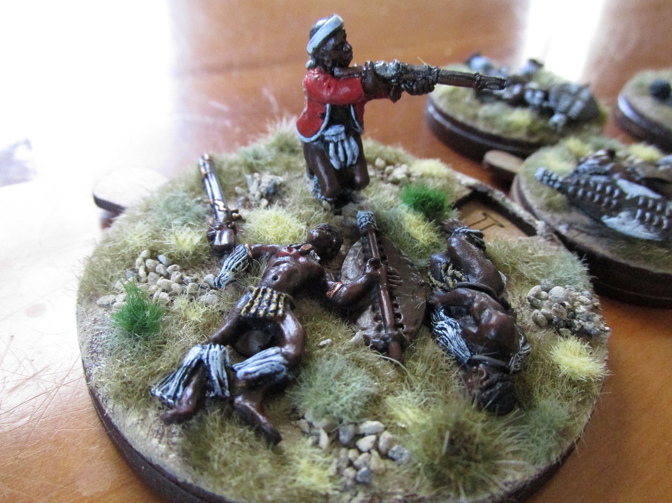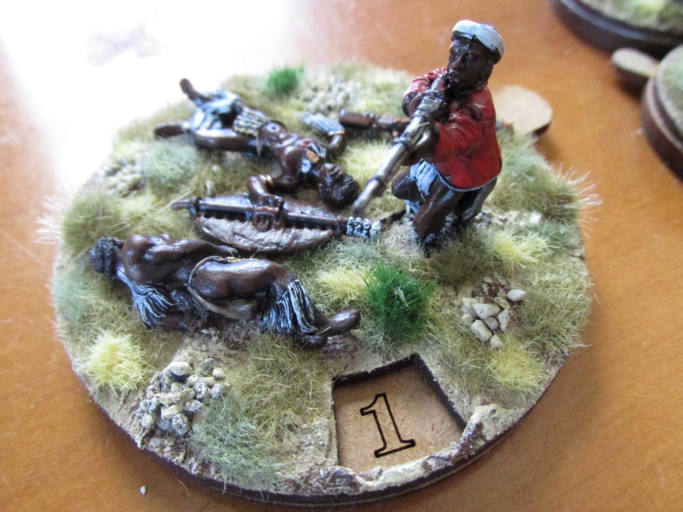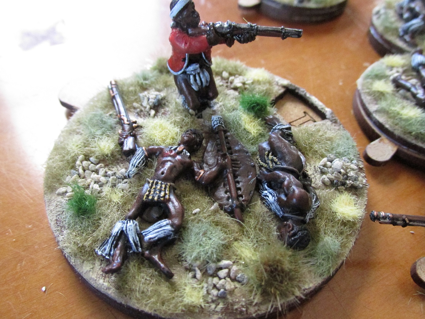 After my last Anglo-Zulu Wars game I decided that dice as casualty markers just don’t cut it. I have a good stash of the wonderful casualty/turn markers from Warbases in the UK. I also had some Zulu casualty figures from Black Tree Designs. Seemed obvious really. The bases have the numbers 0-12 so can be used for both recording casualties or as turn markers.