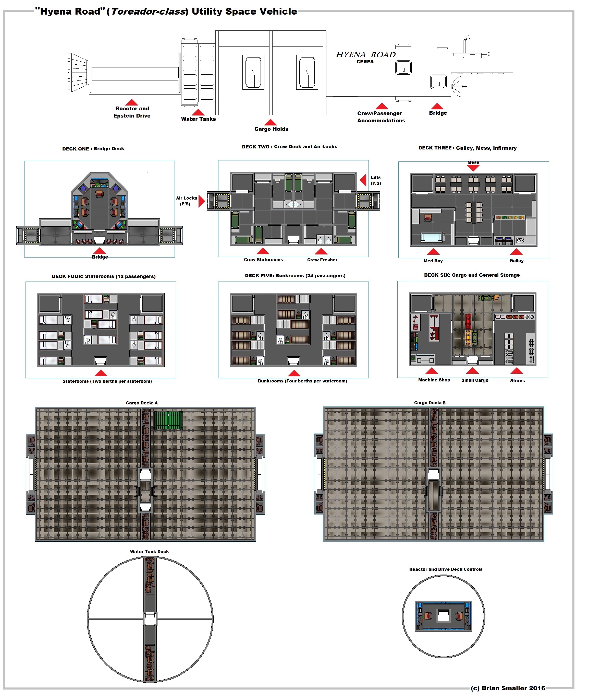 Ships are effectively buildings with the floor being ‘down’. This deckplan is of a small dual purpose passenger and cargo vessel. I used GURPS Spaceships to give me an idea of size and components, but as far as the amount of fuel carried and performance – I just winged it. In The Expanse ships are plot devices so I didn’t bother too much on the details. I figure that the ship has water tanks for reactions mass, and a shielded ‘fuel tank’ to hold some sort of nuclear fuel/reactors.
