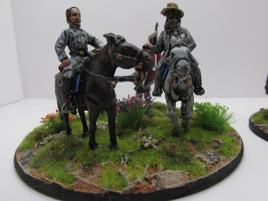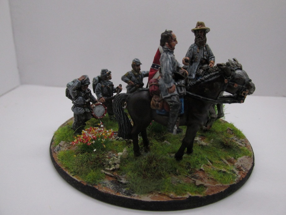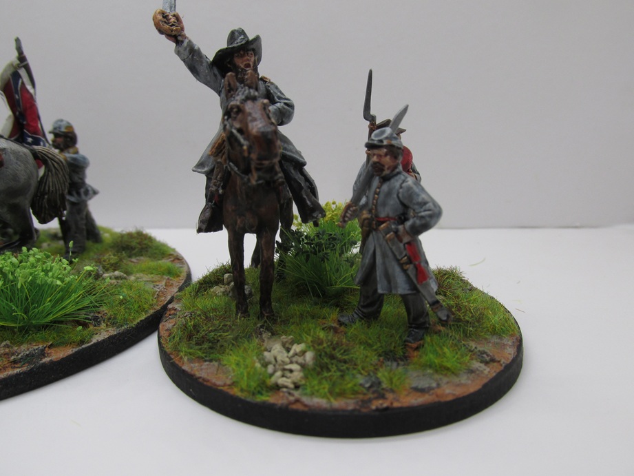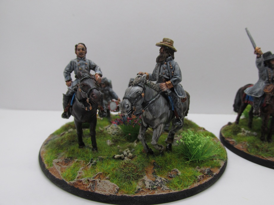 Some speed-painted Confederate Command. The larger base has two mounted Adventure Miniatures figures. I think the two drummer boys are Sash and Saber and honestly, I have no idea who makes the standard Bearer.